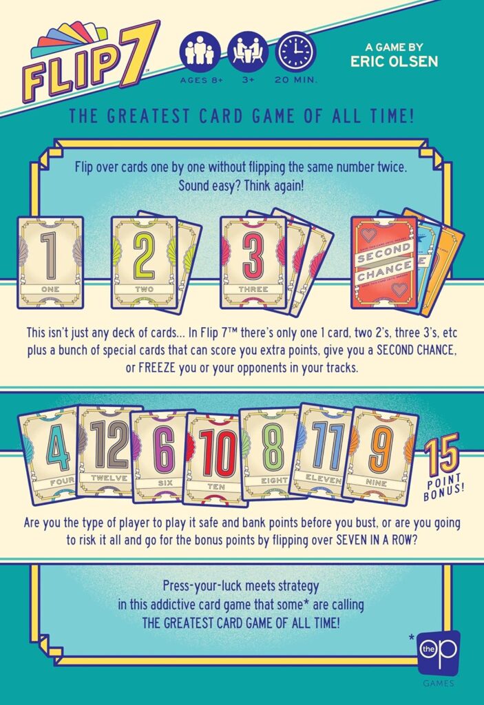 En resumen, Flip 7 es un título que combina emoción, estrategia y partidas rápidas, ganándose el corazón de quienes buscan un juego de cartas que sea tan fácil de sacar a mesa como difícil de dejar de jugar.