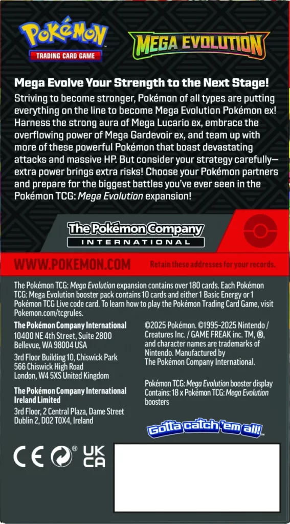 Pokémon Center Elite Trainer Box (Mega Lucario y Mega Gardevoir): Incluye 11 sobres de la expansión y una carta promocional de arte completo de Riolu o Alakazam, con un logo especial de Pokémon Center.